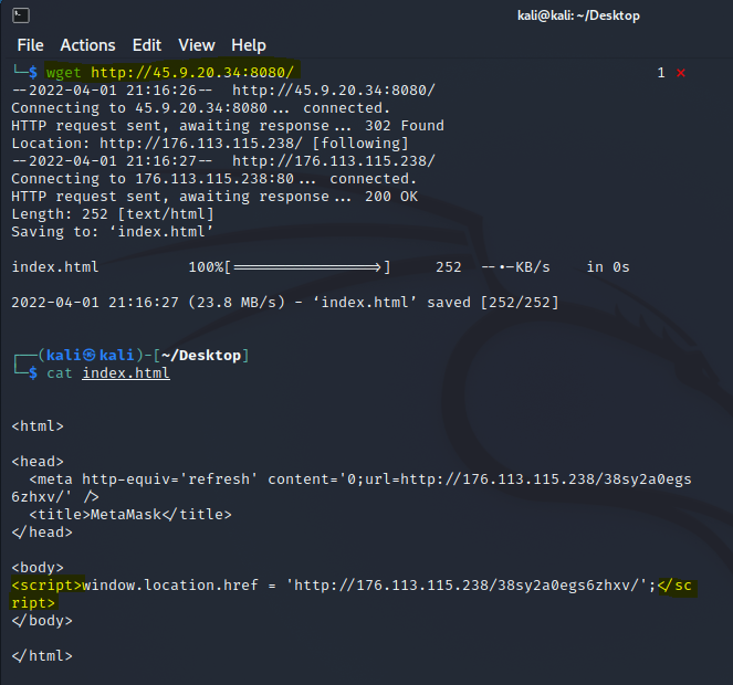 So we wget the new url and view the index file that was downloaded. It's a fancy page with lots of social media icons and styling and probably looks as legit as possible, but thats all part of the ruse: