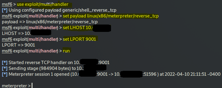 go back to attack vm and you should see you gained a meterpreter reverse shell. Congrats.