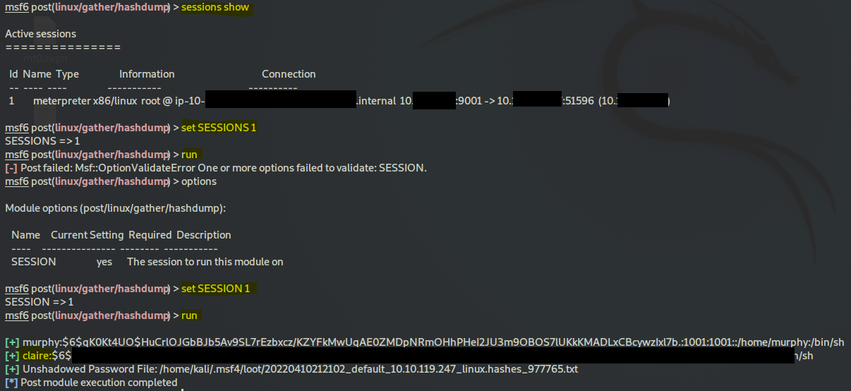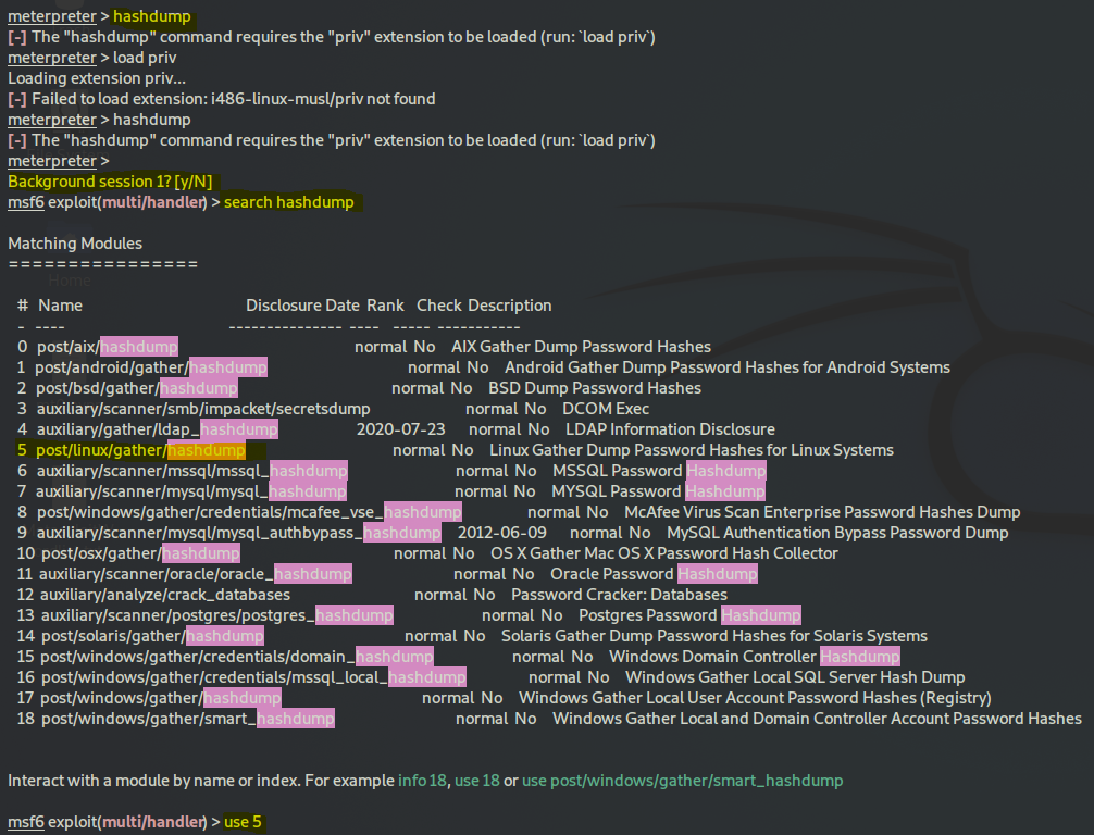 Now to get the hash you could just type hashdump except it didn't work for me because of some missing resource error. Instead I backgrounded the session with pressing CTRL-Z and then: