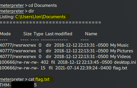 once you get a bash terminal (reverse shell) operational, g to c:\Users\Jon\Documents to find the flag and read it: