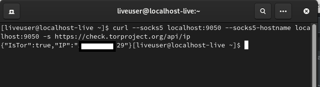 curl --socks5 localhost:9050 --socks5-hostname localhost:9050 -s https://check.torproject.org/api/ip