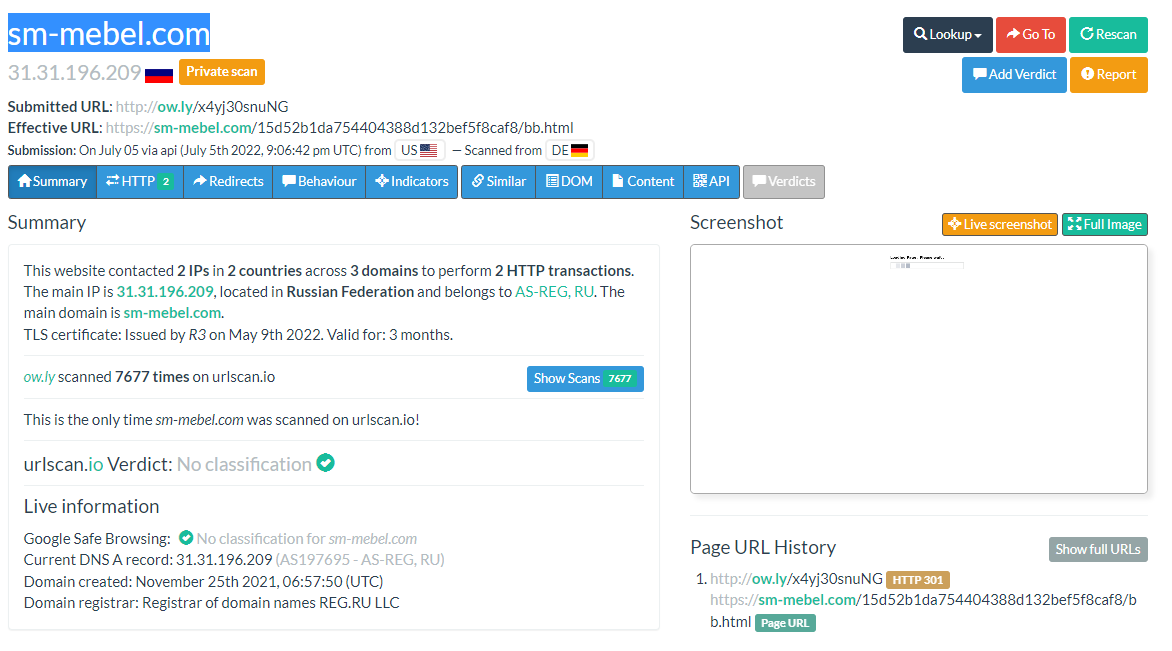 Here is the urlscan results of the page:
