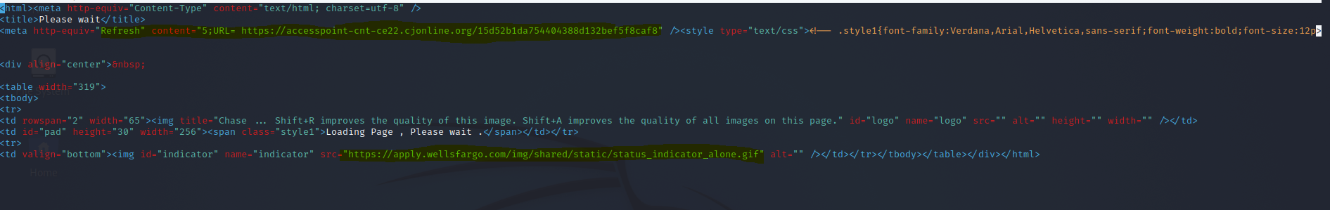 and inspect it, we find that this landing page, after clicking the link on the email, shows a a wellsfargo(cheeky) loading animation and then redirects you to the final malicious page using <meta http-equiv="refresh" content="..." to send you there.