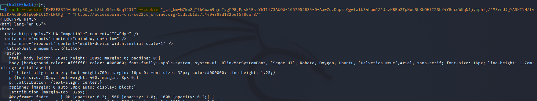 Now, in order to successfully request the html code of the page in bash, I had to set two cookies, "phpsessid" and "_cf_bm" with the curl command options. I used the cookies created in the urlscan detonation: